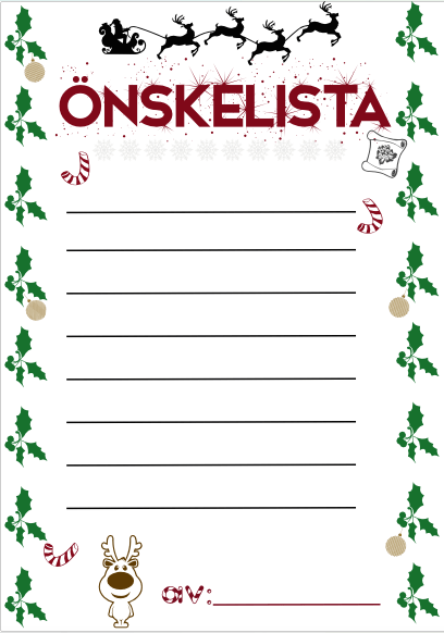 Baka gärna en pepparkaka eller lussebulle åt mig också! Cirka 30 traditionell julmarknad utomhus slott barnvänlig träffa tomten restaurang/lunch finns live. Gotland 29 oktober 2021 09:16. Förmodligen är julen den period då vi visar våra mest givmilda sidor. Idag är det dags för julbaket. Fråga efter önskelista eller överraska med en julklapp som känns passande. Ringa (eller maila) till jultomten; Han behöver få veta vad du önskar dig i julklapp! Man kan åka häst och vagn, barnen kan lämna önskelista till tomten och lyssna på j. Små lappar med charader = leka charader; Hjälp mig gärna att ge dem bröd eller fågelfrön. Tomten har ställt ut sin postlåda på lilla scenen och finns där så du kan säga hej, ta ett kort och överlämna din önskelista. Välj att skriva ut på din skrivare, för de flesta behövs inga andra inställningar än pappersformat , färg eller gråskala och om det ska vara en kantfri utskrift.